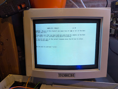 After a friendly warning that you really need to read the flippin' manual and a couple more confirmation screens (which disk to select being the main one - default is SCSI 0 LUN 0 which is fine), a rather utilitarian menu appears.
